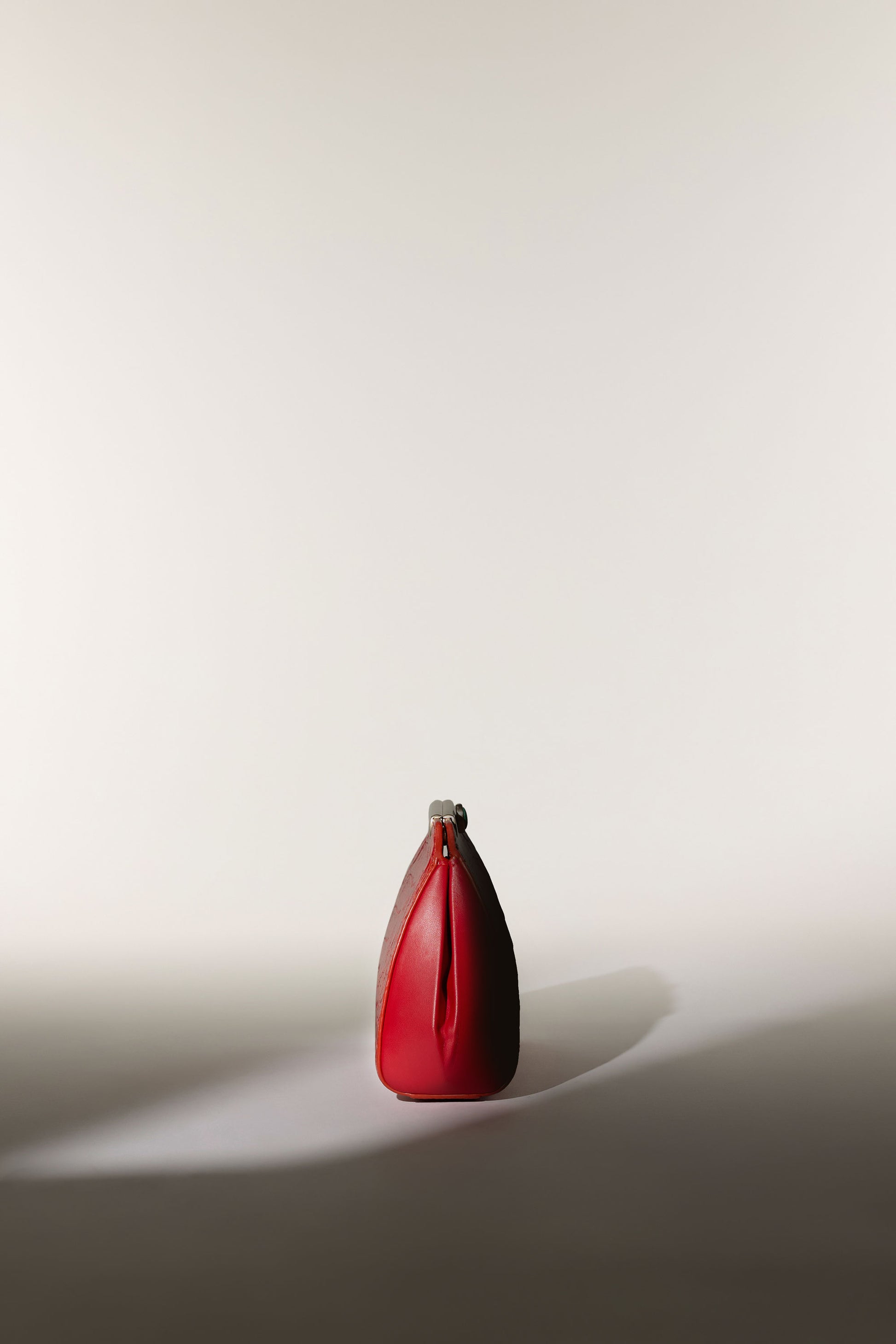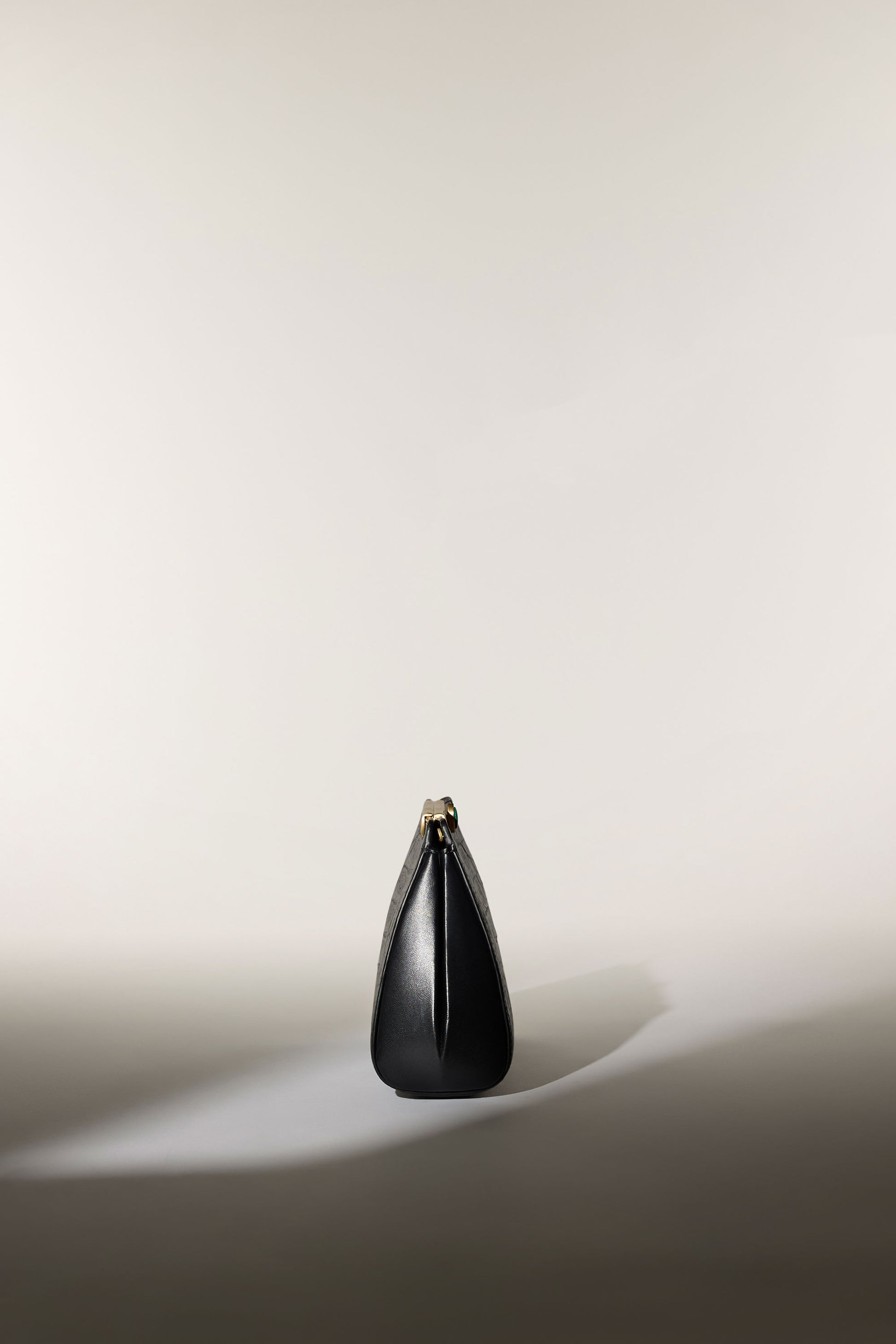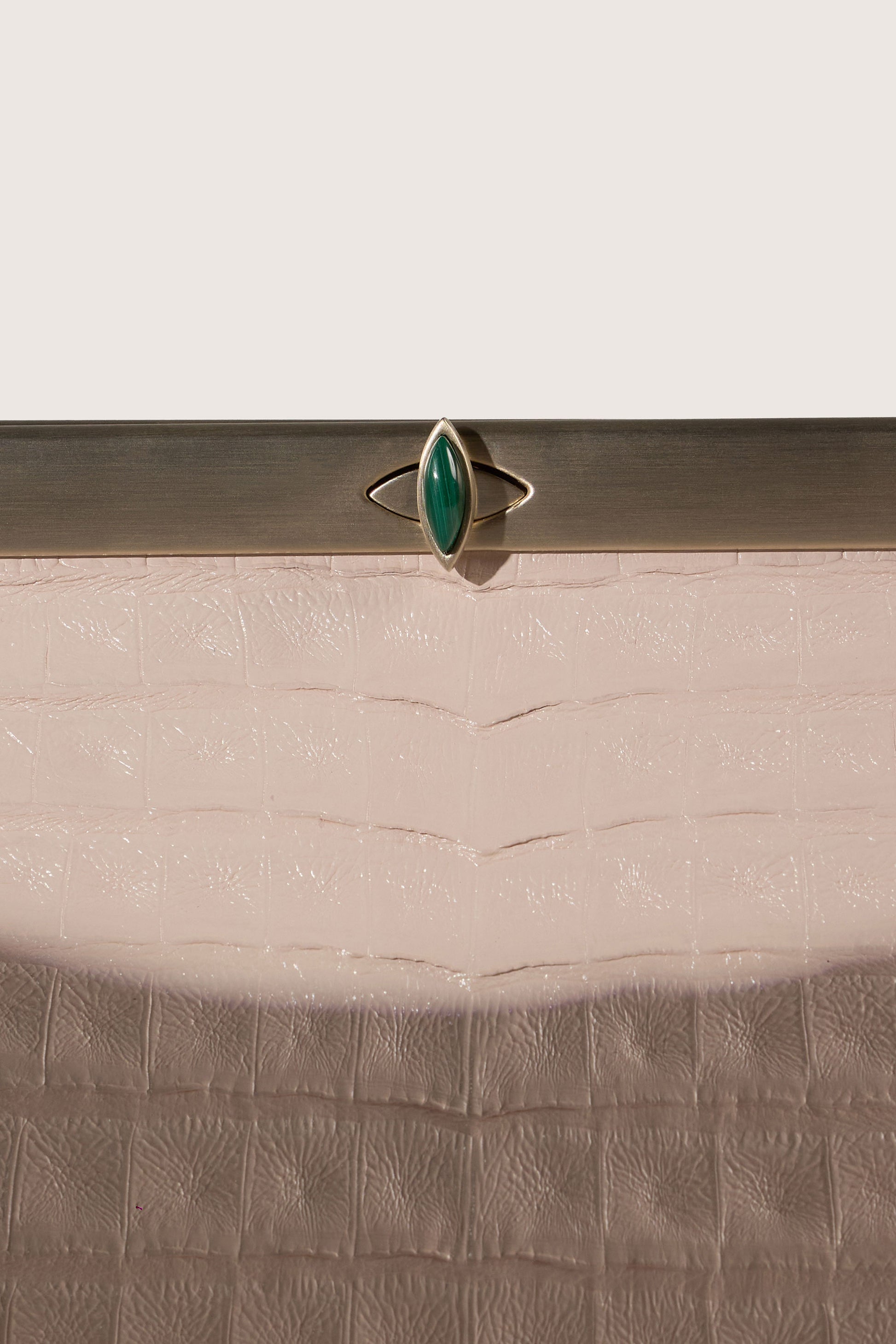 Conceived as a piece of contemporary art to be held in the palm of your hand, Iris is a structured clutch in Yacaré caiman leather, embellished with a jewel-like clasp in 24k gold-plated brass and natural malachite. Both essential and refined, it’s the perfect companion for evening wear and special occasions.