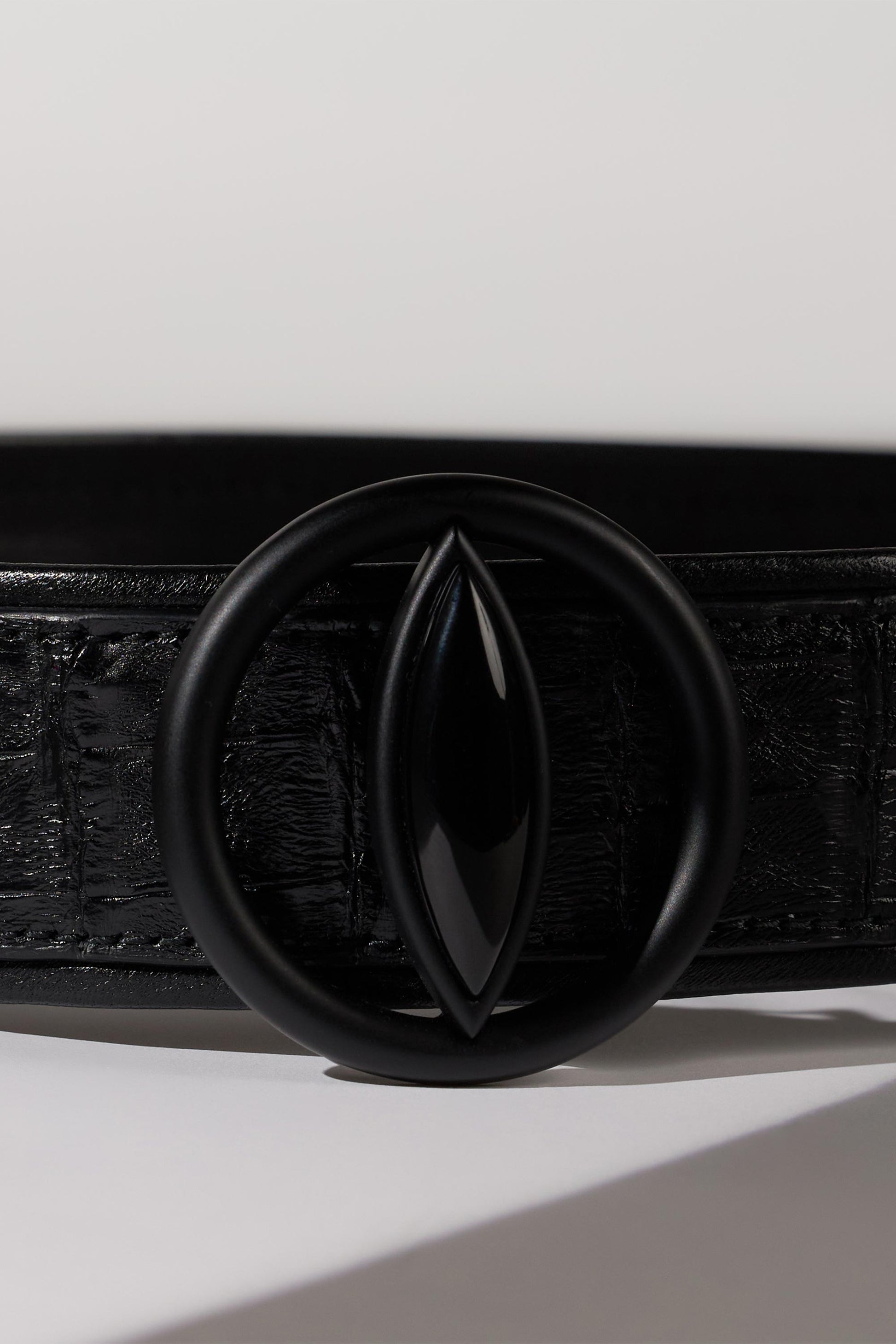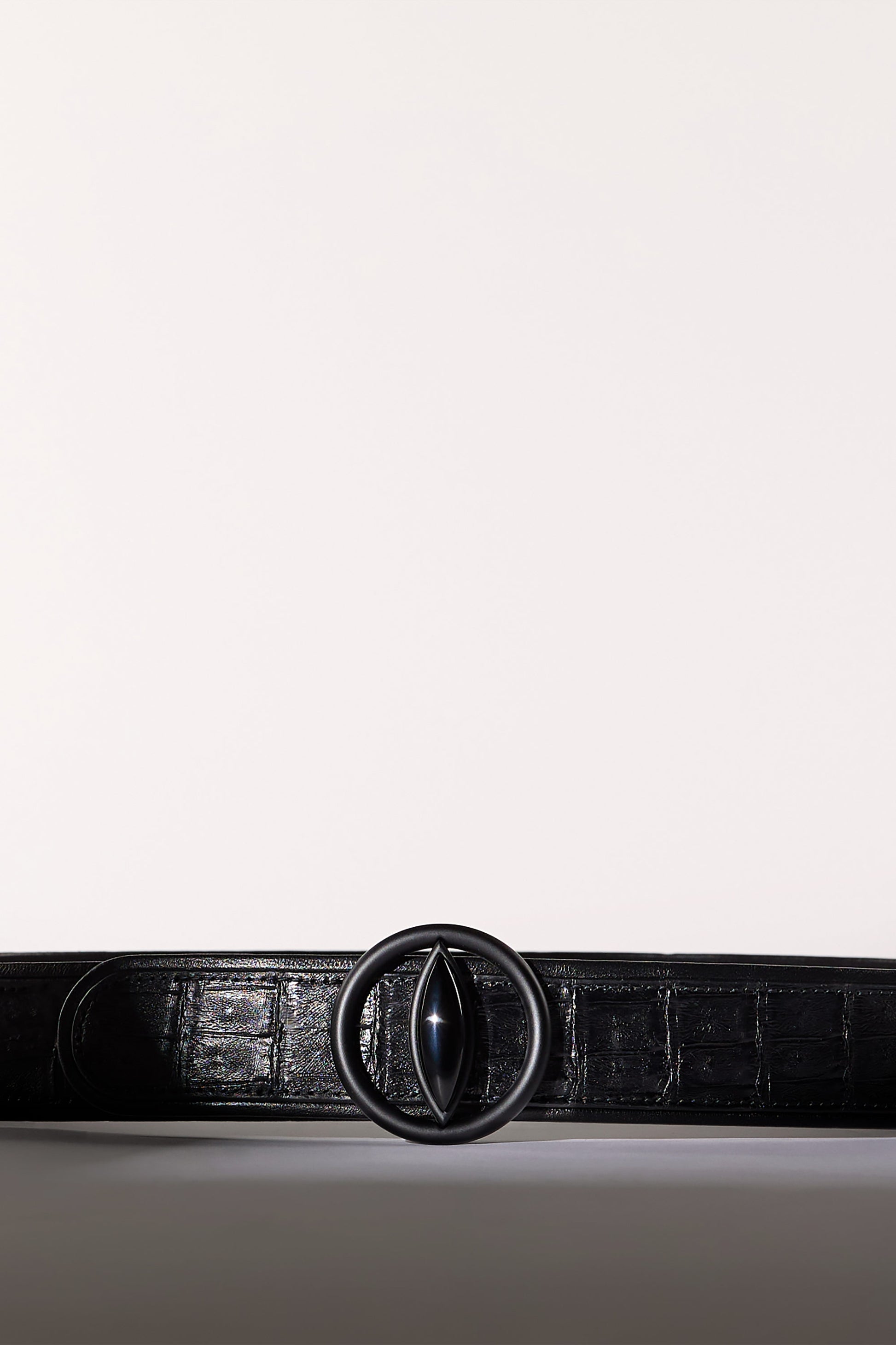 A slim, sophisticated belt designed to complete any look with effortless grace. The distinctive texture of Yacaré caiman leather meets a custom-crafted metal buckle with a black galvanic finish, elevated by a with natural onyx or malachite. A statement of understated luxury.